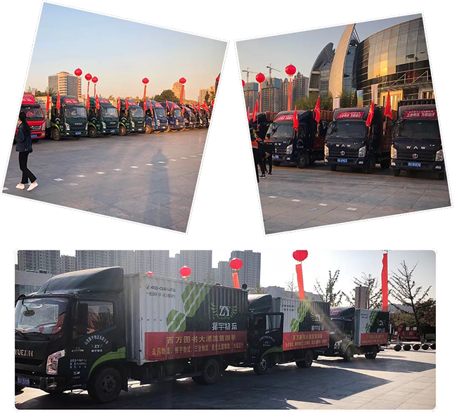 振宇物流積極捐贈(zèng)圖書(shū),為愛(ài)護(hù)航 ,通過(guò)自己的方式和力量,助力百萬(wàn)圖書(shū)大漂流!現(xiàn)場(chǎng)物流車(chē)輛整齊排開(kāi),氣勢(shì)如虹……