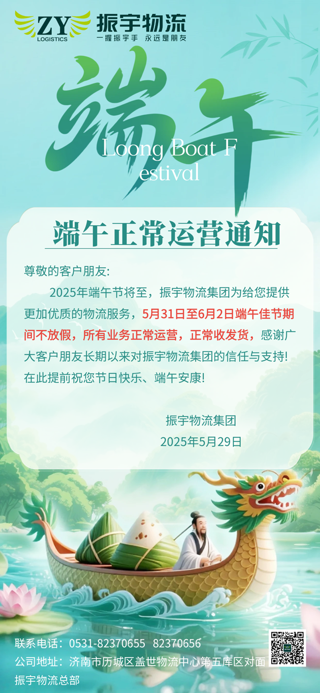 2025年端午節(jié)將至,振宇物流集團(tuán)為給您提供更加優(yōu)質(zhì)的物流服務(wù),5月31日至6月2日端午佳節(jié)期間不放假,所有業(yè)務(wù)正常運(yùn)營(yíng),正常收發(fā)貨,感謝廣大客戶(hù)朋友長(zhǎng)期以來(lái)對(duì)振宇物流集團(tuán)的信任與支持!在此提前祝您節(jié)日快樂(lè)、端午安康!