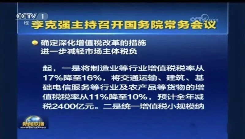會議指出,過去五年通過實(shí)施營改增累計(jì)減稅2.1萬億元。按照黨中央、國務(wù)院部署,為進(jìn)一步完善稅制,支持制造業(yè)、小微企業(yè)等實(shí)體經(jīng)濟(jì)發(fā)展,持續(xù)為市場主體減負(fù),會議決定,從2018年5月1日起,一是將制造業(yè)等行業(yè)增值稅稅率從17%降至16%,將交通運(yùn)輸、建筑、基礎(chǔ)電信服務(wù)等行業(yè)及農(nóng)產(chǎn)品等貨物的增值稅稅率從11%降至10%,預(yù)計(jì)全年可減稅2400億元。