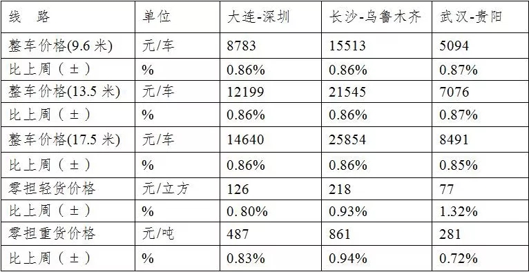 各車型指數(shù)均有不同程度回升,本周整車指數(shù)為967.4點(diǎn),比上周回升0.93%;零擔(dān)重貨指數(shù)為965.6點(diǎn),比上周回升0.87%;零擔(dān)輕貨指數(shù)為1014.64點(diǎn),比上周回升0.78%。