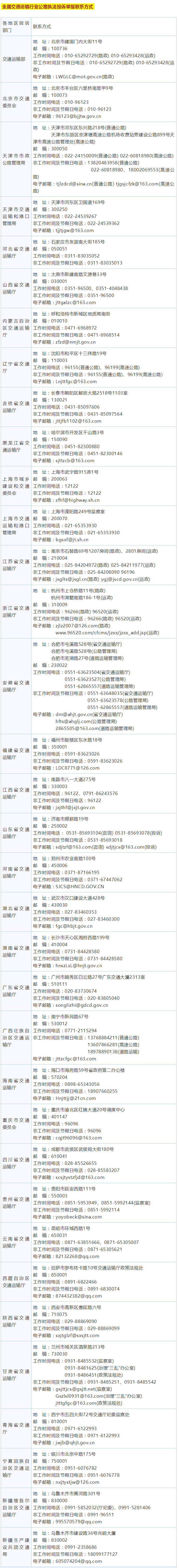交通運(yùn)輸部公路局、道路運(yùn)輸司聯(lián)合向社會集中公布全國交通運(yùn)輸行業(yè)公路執(zhí)法行風(fēng)投訴舉報電話、通信地址和電子郵箱地址。